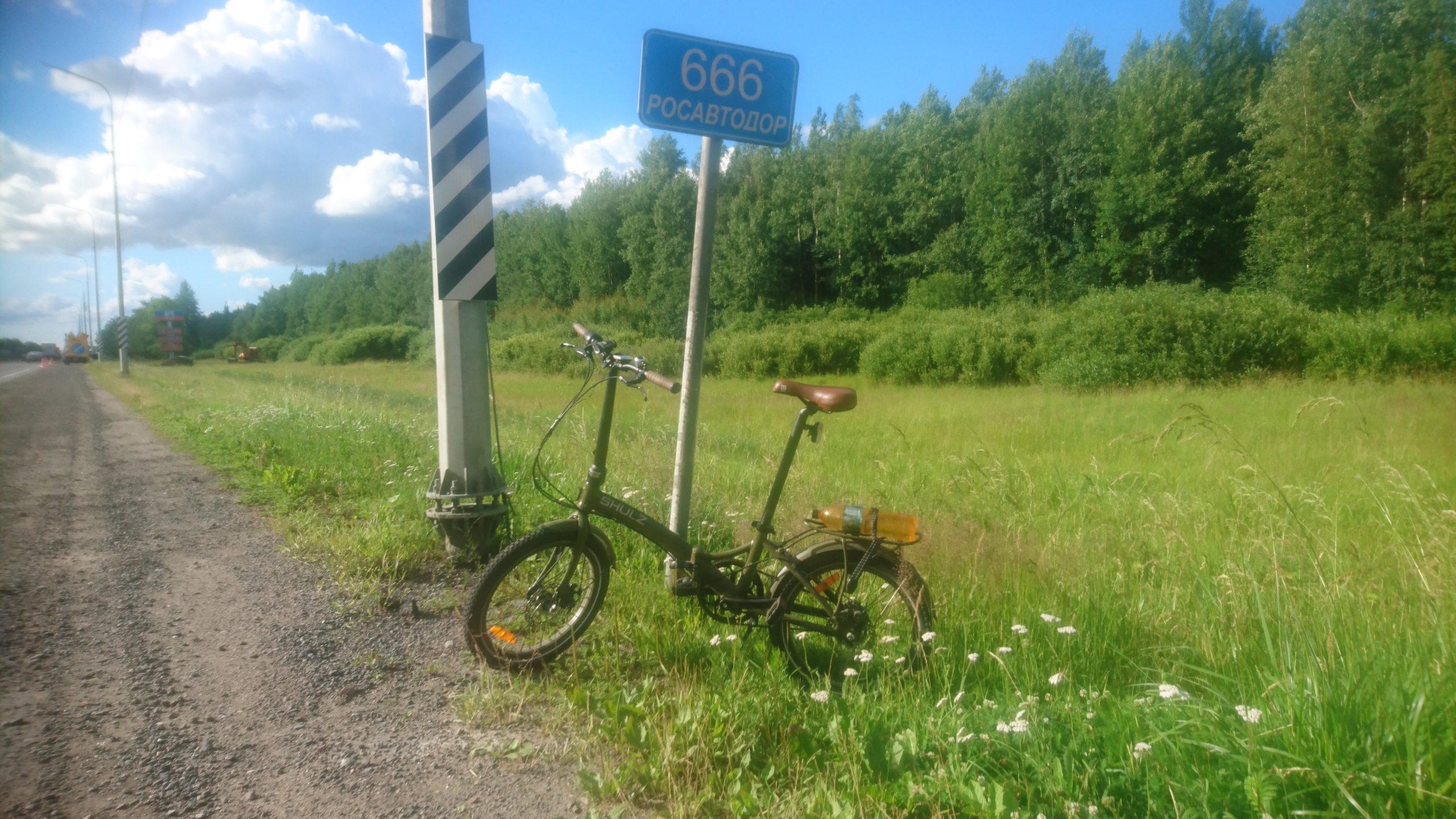 Вчера я впервые проехал на велике дистанцию, выраженную трёхзначным числом — 105 км, это мой новый рекорд! Я под этим постом прикрепил фото показаний велокомпа и примерную схему маршрута. Забавное совпадение: через 10 минут после того, как сделал фото указателя с номером 666 (это было в окрестностях Пушкина) — откуда ни возьмись, пошёл ливень с мелким градом, хотя до этого на небе вообще не было грозовых туч. Воистину число 666 — роковое 🙂